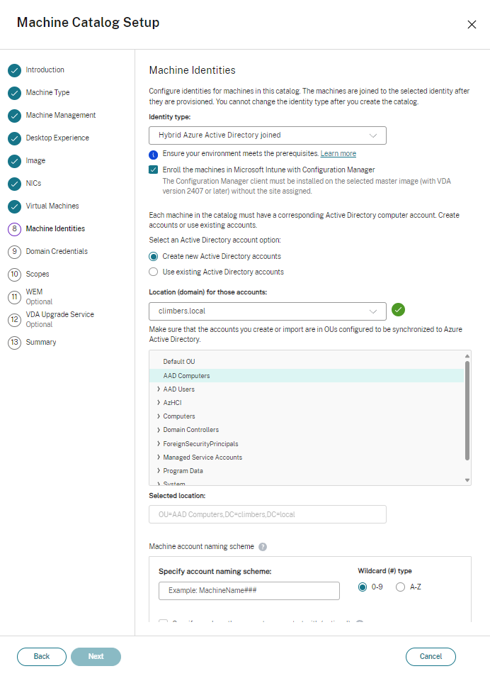 Create your machine catalog for your Hybrid Entra ID, and Intune joined devices and use the “Hybrid Azure Active Directory joined” option. Select “Enroll the machines in Microsoft Intune with Configuration Manager” and finish by selecting the appropriate options for your environment for Active Directory accounts and OU location.