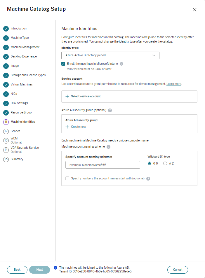 For Entra ID and Intune, create your machine catalog, use the “Azure Active Directory joined” identity type, and select “Enroll the machines in Microsoft Intune”: