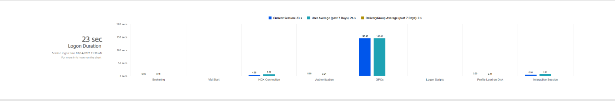 The User Details page provides an overview of access times to help managers identify potential bottlenecks and streamline the access process. Graphical representations, such as charts, provide a clear understanding of session initiation rates and access times.These graphs depict the different steps of the login process, including boot, VM start, HDX login, authentication, GPO, registration, load profile from disk, and interactive session. Managers can track time spent at each stage, identify areas for improvement, and improve access to work.