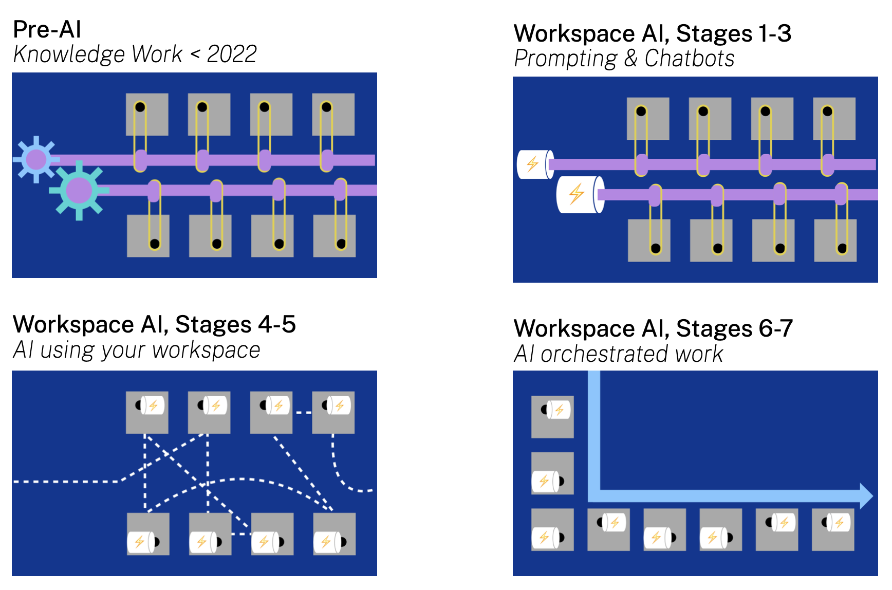 But this isn’t how real change works over time. Moving forward, AI’s capabilities will reshape workflows, roles, and org structures. But this kind of impact won’t arrive all at once, unfolding instead via a series of incremental steps which will only be obvious in hindsight. This is why we need to focus on that roadmap to envision what the future will really be like.